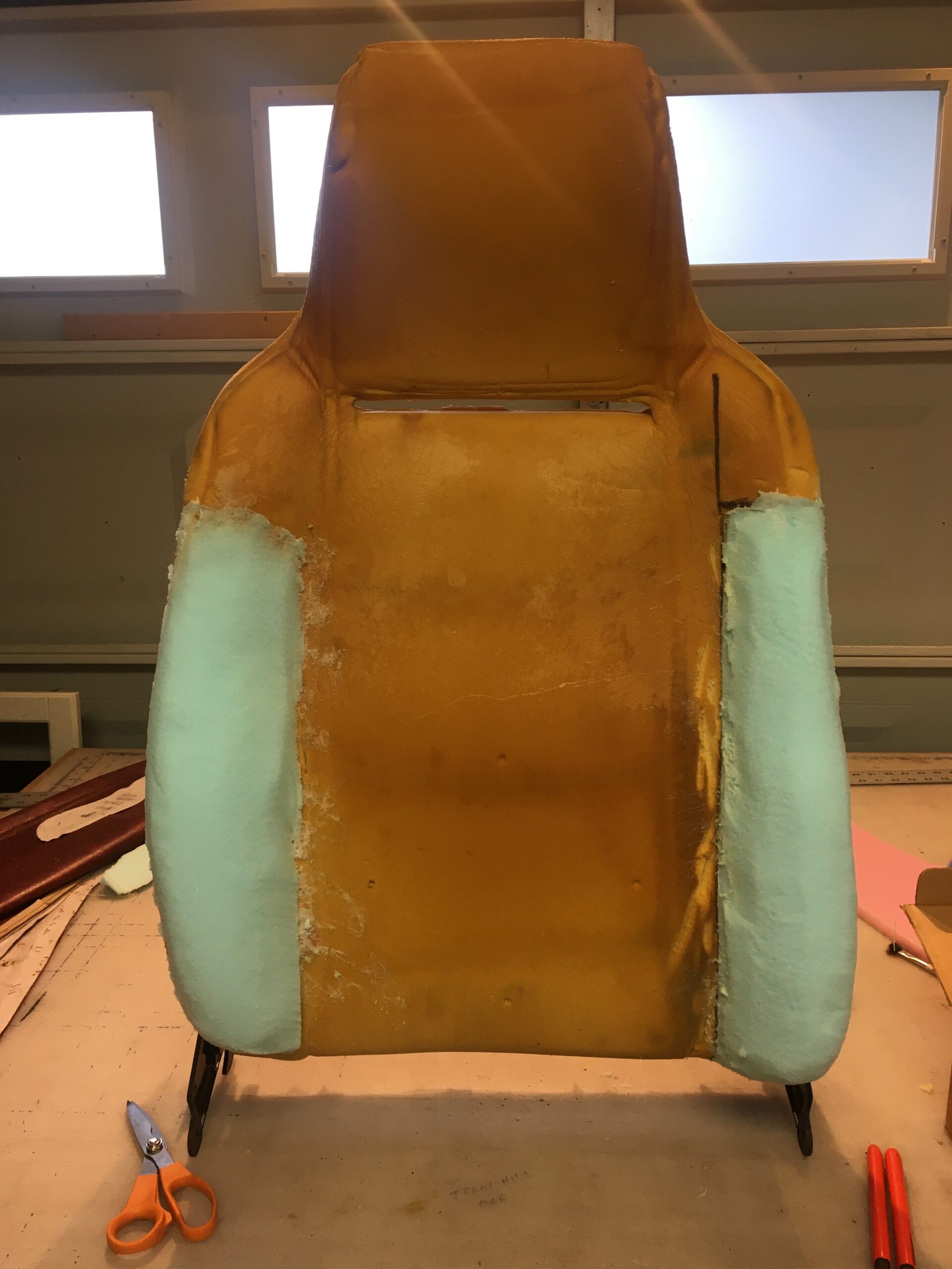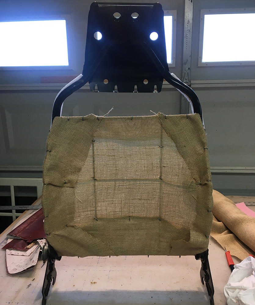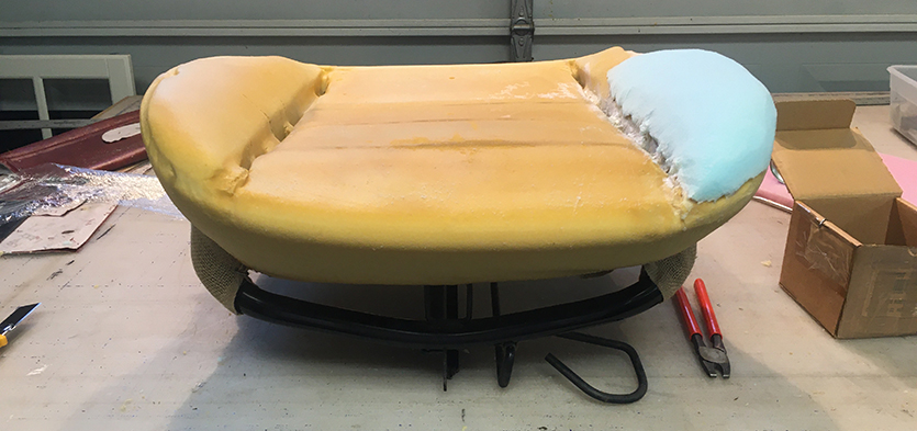 The foam was breaking down and had started to sag through the frame. The frame was reinforced with burlap and then the foam was replaced. Reproduction foam is not available for these seats, and since only certain areas were worn, I replaced the sections that were mishapen.