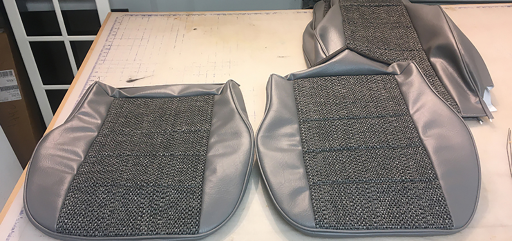 The interior was originally burgundy, but all components were changed to grey. Broken plastic trim was replaced, and all were carefully painted to match the new grey vinyl color. A coordinating Perennials fabric was used for the inserts.