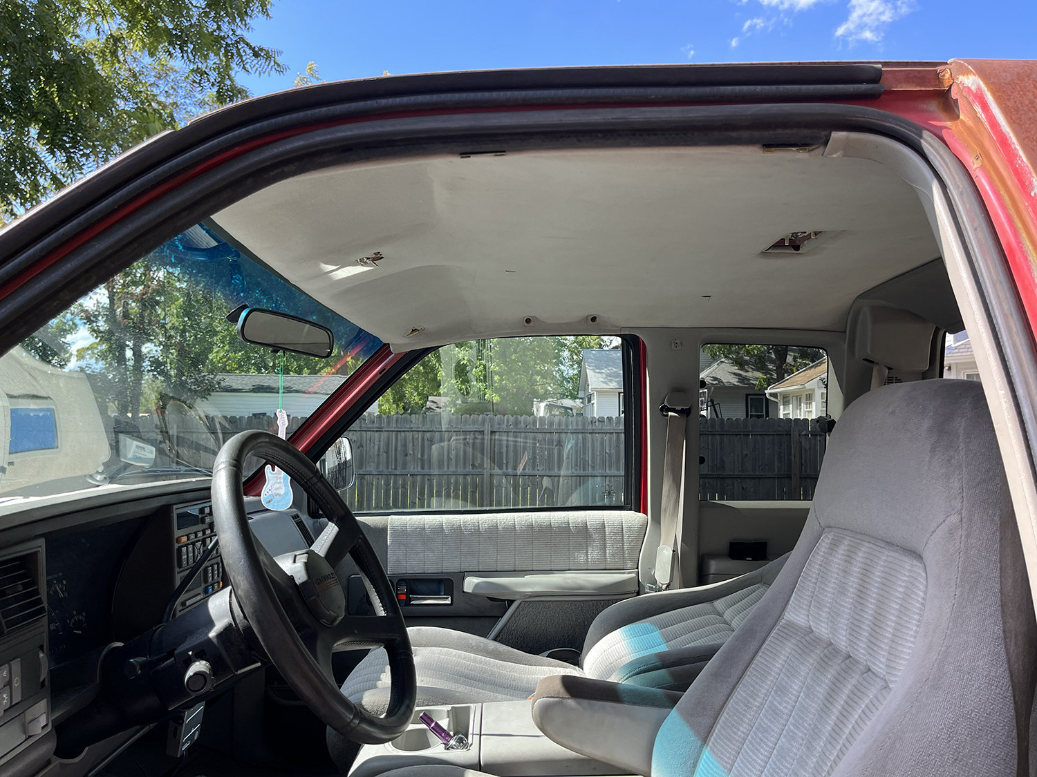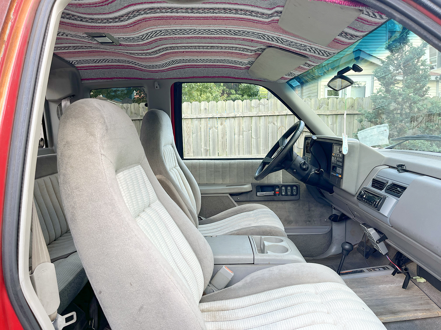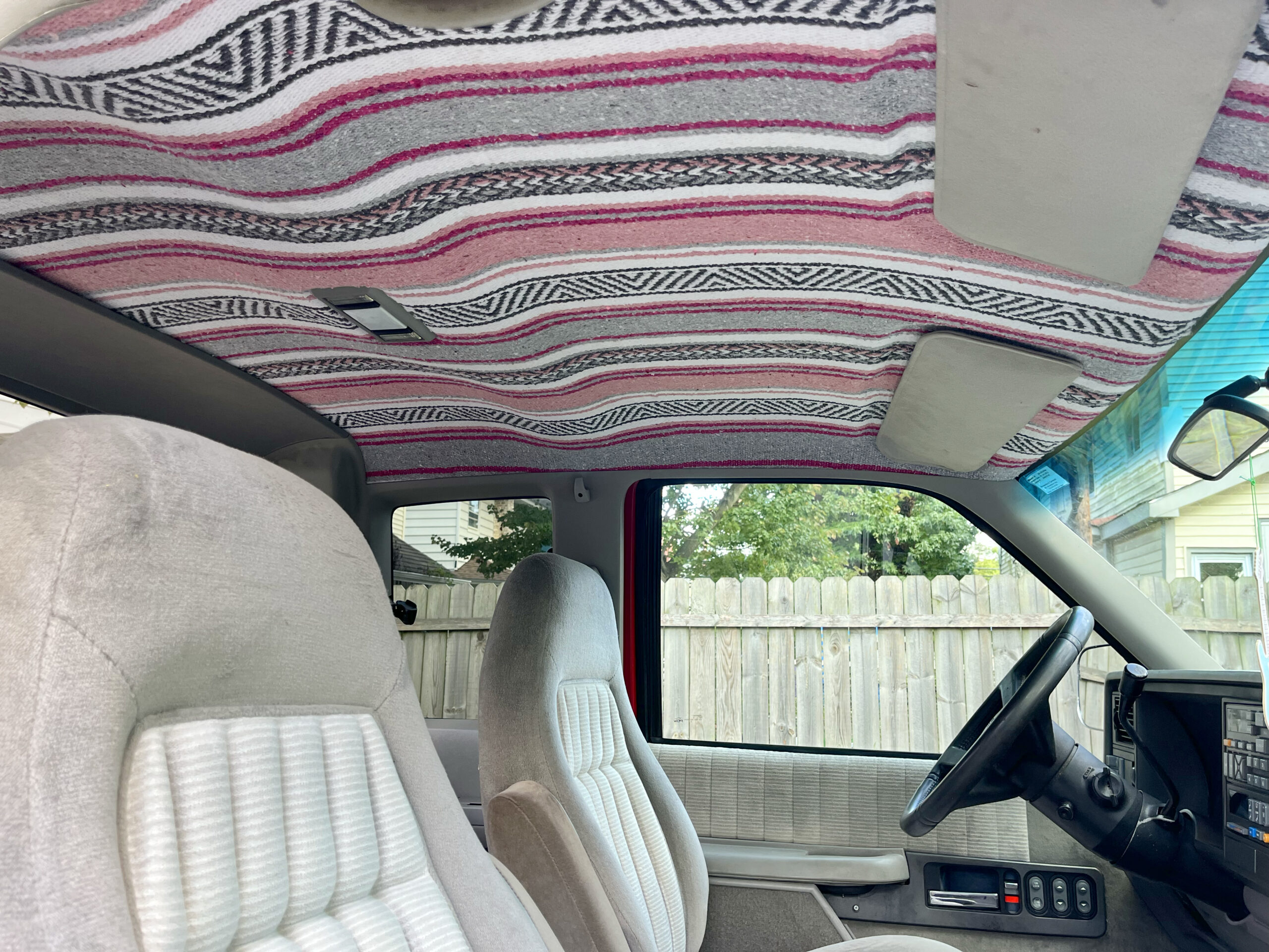This scrappy ’94 Silverado has been in the client’s family for generations. It’s now going on to be his daughter’s ride along the Jersey Shore. The client is a local Asbury Park furniture manufacturer and wanted to add a custom touch to this ride. He and his daughter chose a handwoven beach blanket in a coordinating pink and grey to replace the sagging headliner.